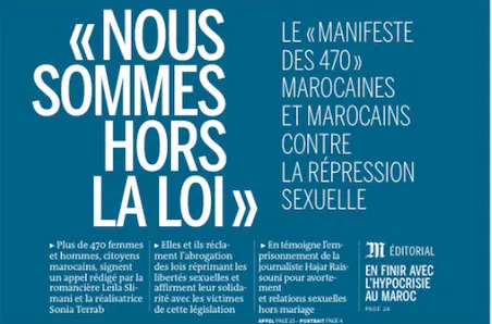 Nous, citoyennes et citoyens marocains, déclarons que nous sommes hors la loi. Nous violons des lois injustes, obsolètes, qui n’ont plus lieu d’être. Nous avons eu des relations sexuelles hors mariage. Nous avons subi, pratiqué ou été complices d’un avortement. Nous avons appris à feindre, à composer, à faire semblant. Pour combien de temps encore ?