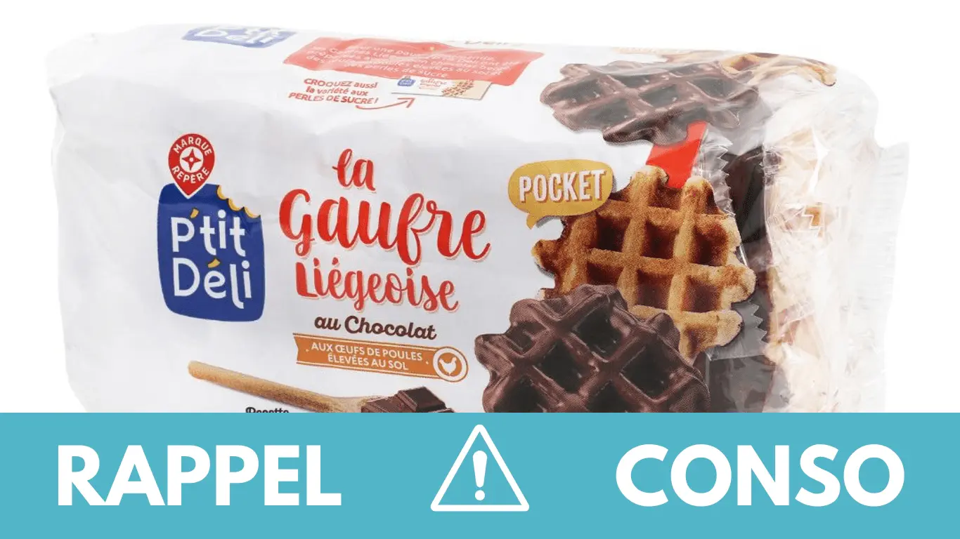 Le rappel consommateur concerne les GAUFRES LIEGEOISES AU CHOCOLAT 402G de la marque P’TIT DELI, commercialisées dans les enseignes E.LECLERC de France entière du 21/10/2025 au 23/10/2025 et les GAUFRES LIEGEOISES NATURE 5x50G de la marque LES PATISSADES, commercialisées dans les enseignes ALDI de France entière du 02/10/2025 au 24/10/2025.