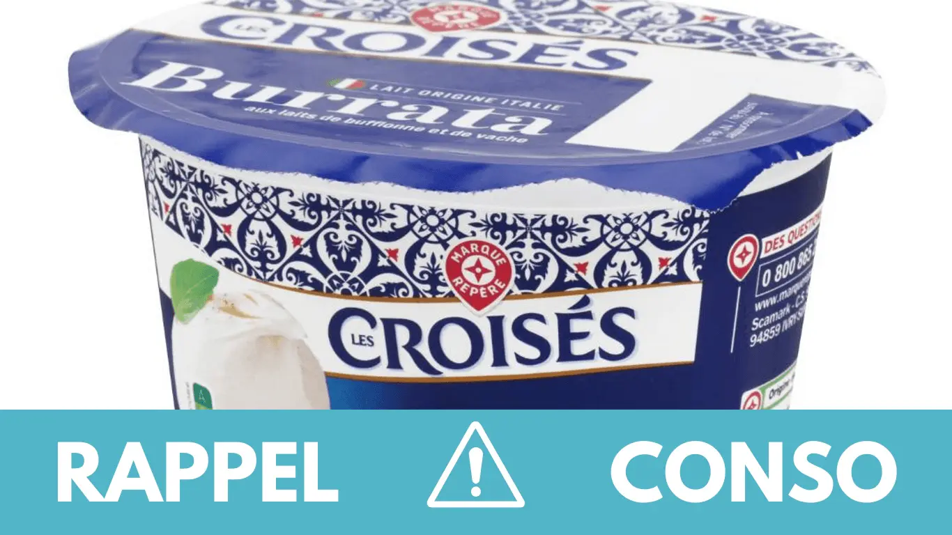 Le rappel consommateur concerne la BURRATA SACHET 125 GRAMMES de la marque LES CROISES. Elle a été commercialisée dans les enseignes E.LECLERC de France entière du 03/07/2024 au 19/07/2024.