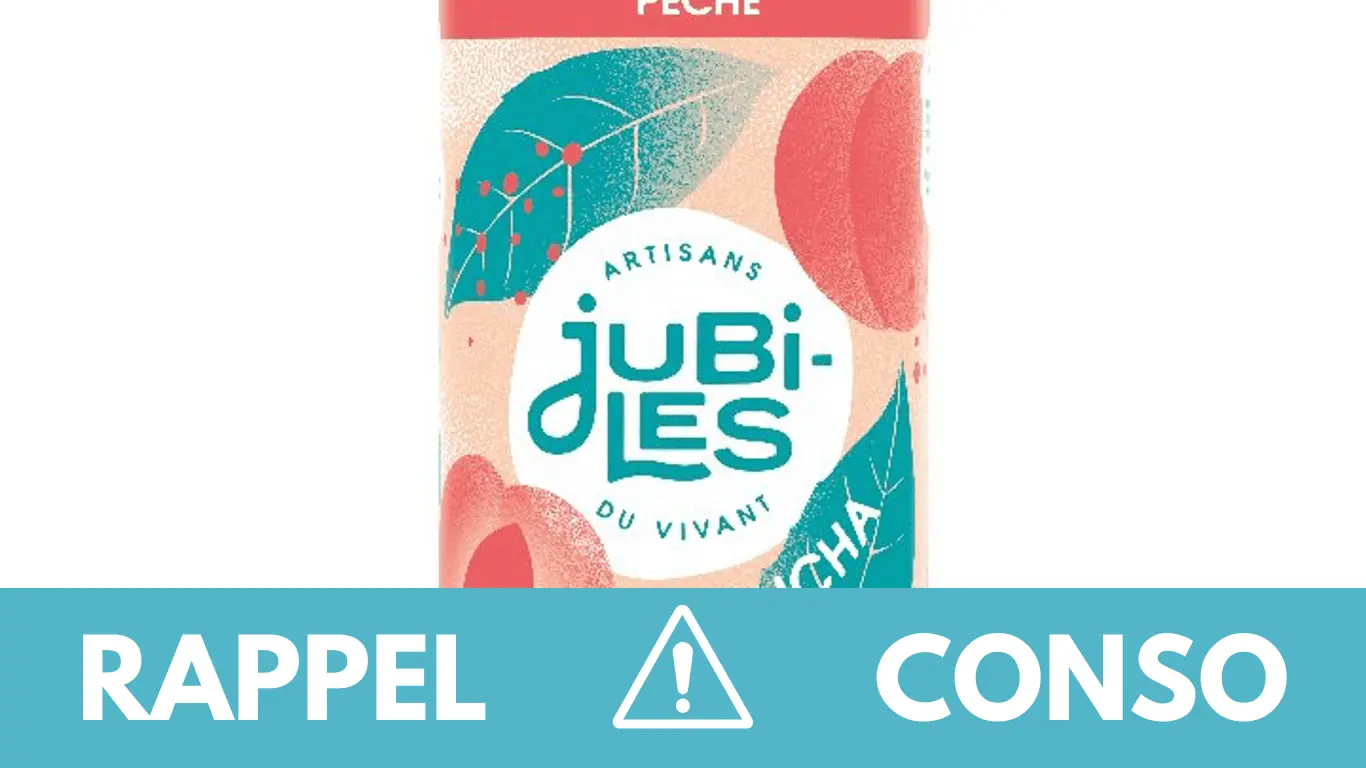 - le kombucha pêche 1L de la marque Jubiles. Il est commercialisé dans les enseignes Biocoop, Naturalia, Vitafrais, provinces bio, pronadis de France entière. Il s’agit du lot 3770010589440 PE240531 Date de durabilité minimale 10/02/2025