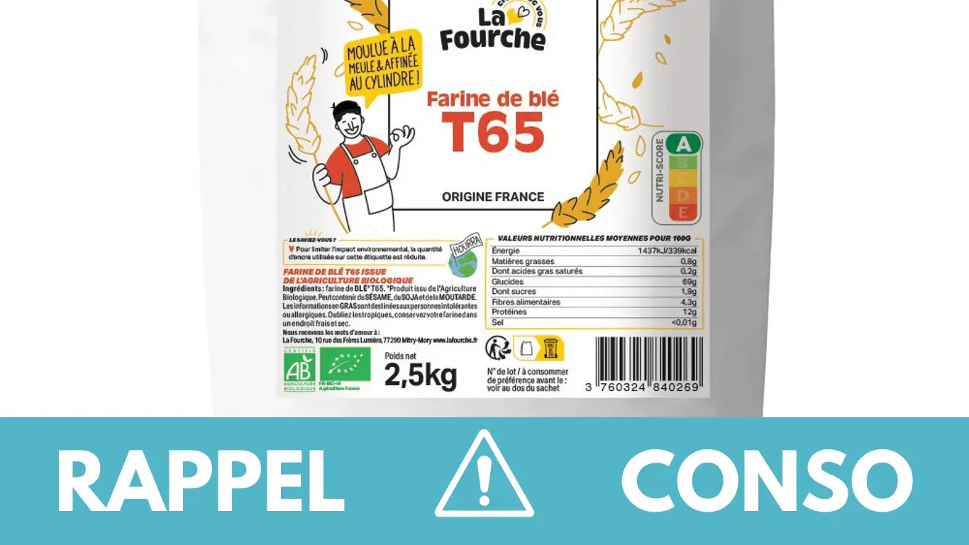 Le rappel consommateur concerne la Farine de blé T65 Bio de la marque La Fourche. Elle a été est commercialisée dans les enseignes La Fourche, distributeur en ligne. Il s’agit du lot 3760324840269 520B07F4/11 Date de durabilité minimale 06/11/2026.