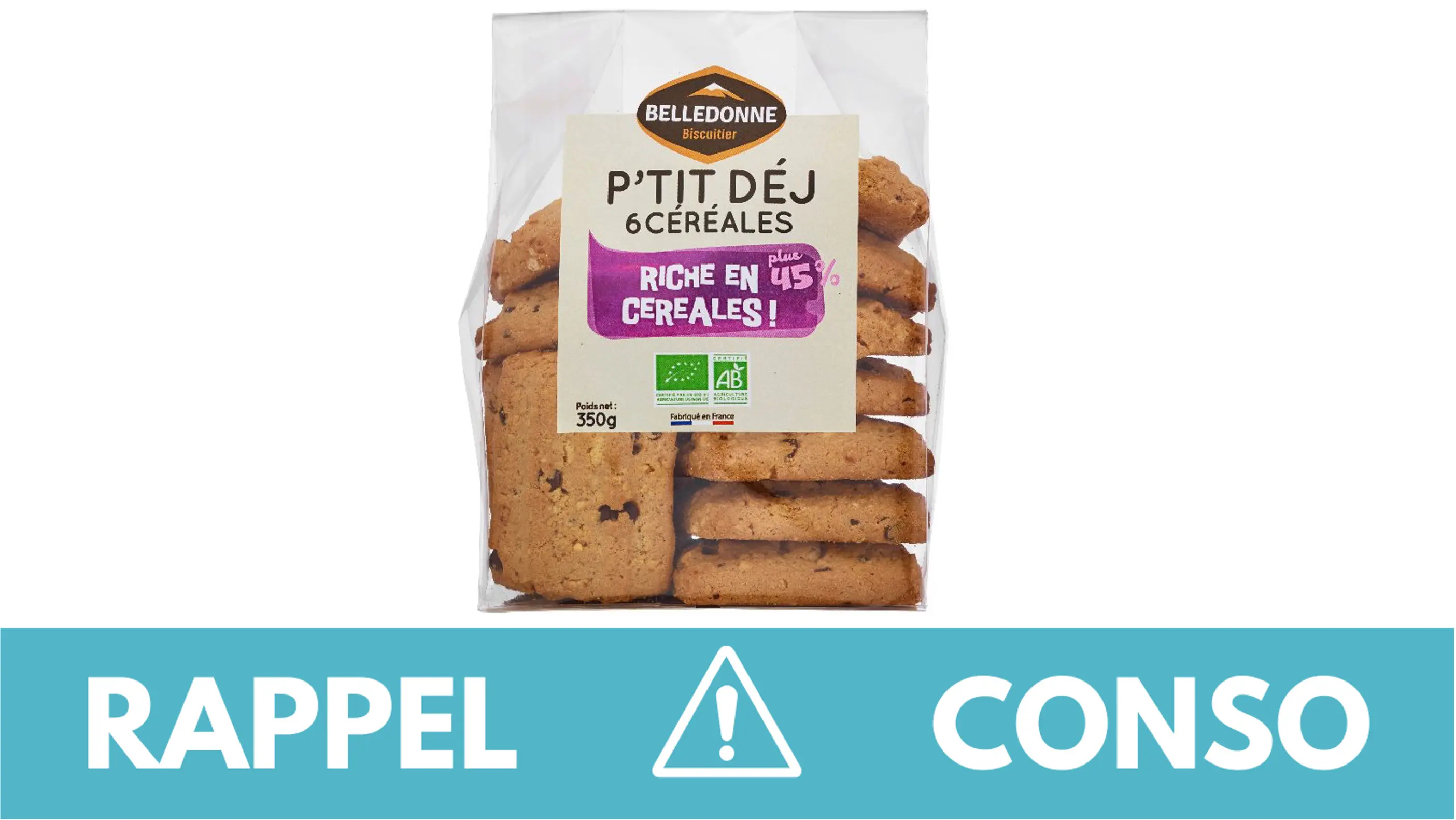 Le rappel consommateur concerne les Biscuits P'TIT DEJ 6 CEREALES 3KG VRAC EAN 13 : 3760109056496 001014 et les Biscuits P'TIT DEJ 6 CEREALES en sachet de 350G EAN 13 : 3760109056847 de la marque BELLEDONNE. Ils ont été commercialisés dans plusieurs enseignes et magasins bio (Biocoop, Biomonde, Biorégion, Botanic, Casabio, La Vie Clair, Naturalia...) de France entière du 07/02/2023 au 28/07/2023.