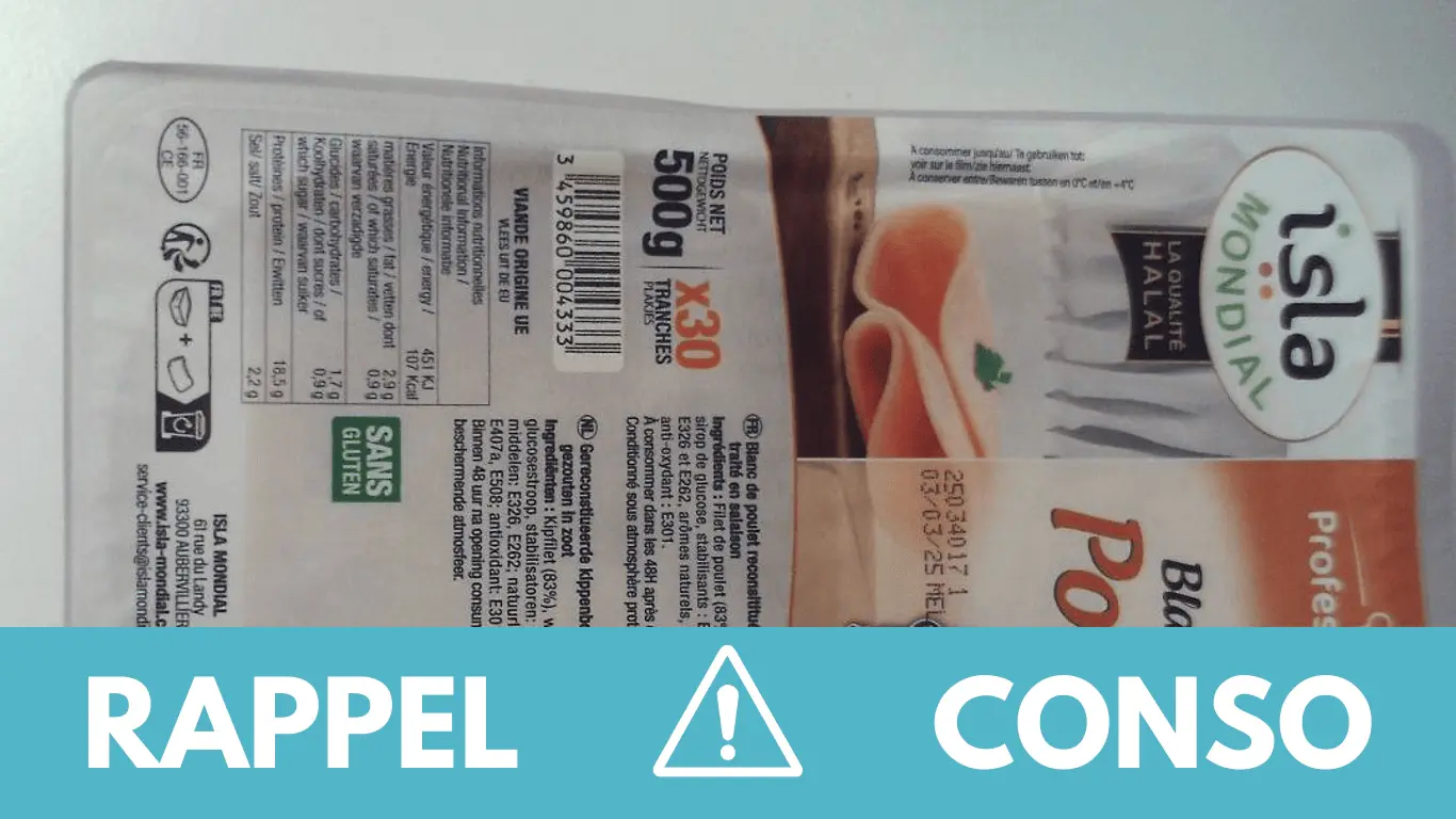 Le rappel consommateur concerne le Blanc de Poulet tranché 500g de la marque ISLA MONDIAL. Il est commercialisé dans les enseignes Logidis, Metro, et différents grossistes de France entière du 28/01/2025 au 29/01/2025.