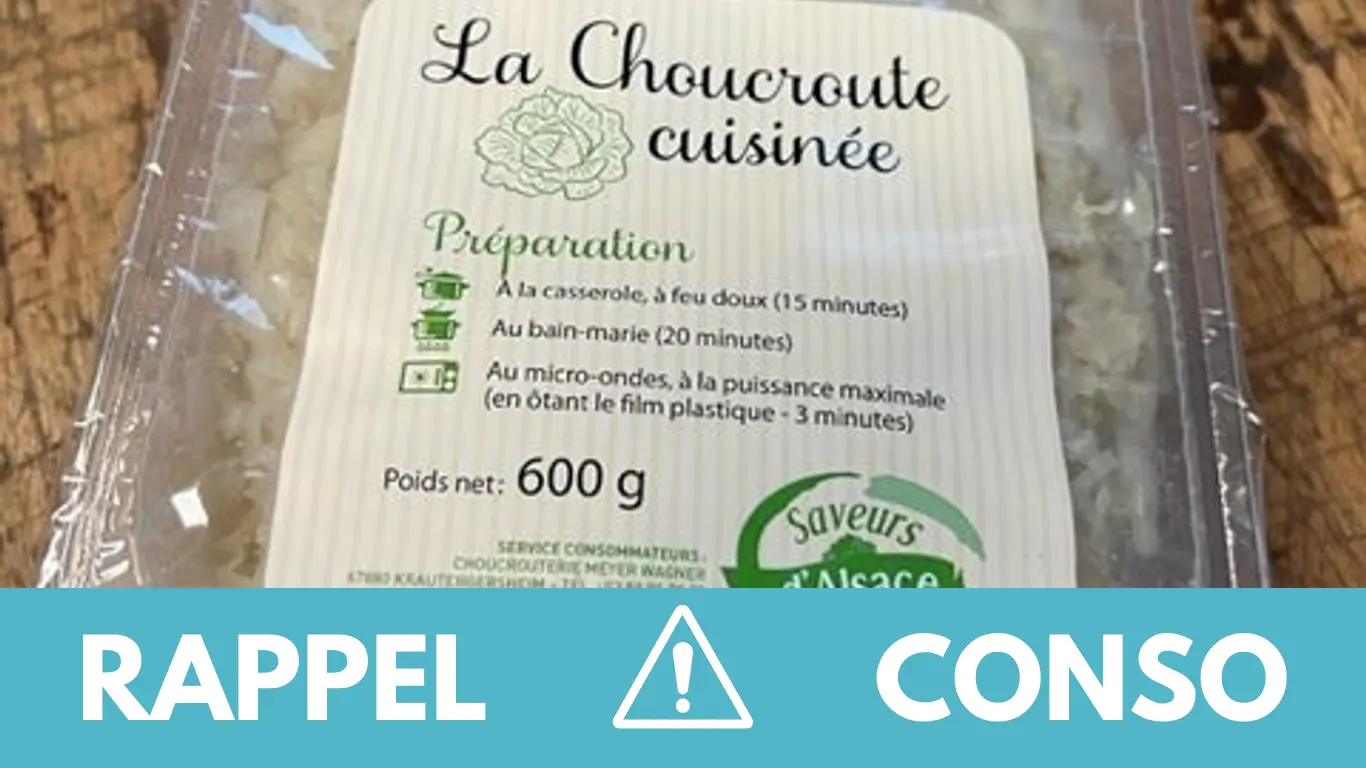 Le rappel consommateur concerne la Choucroute cuisinée 600g de la marque Saveurs d'Alsace. Elle a été commercialisée dans les enseignes Carrefour de France entière du 24/10/2023 au 13/11/2023.