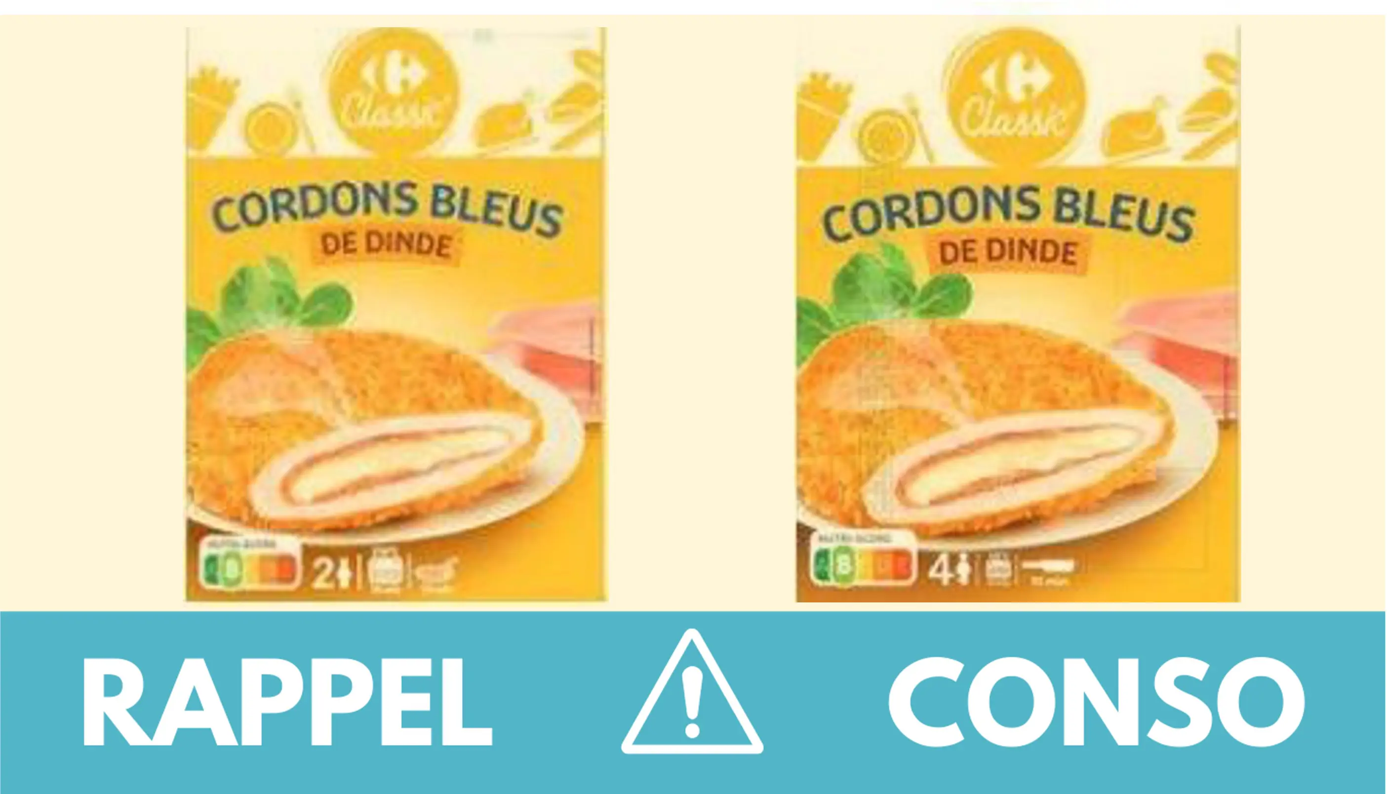 Le rappel consommateur concerne le CORDON BLEU DE DINDE 200 G X 2 et le CORDON BLEU DE DINDE 400G X4 de la marque CARREFOUR CLASSIC. Ils ont été commercialisés dans les enseignes Carrefour de France entière du 13/05/2023 au 19/06/2023.