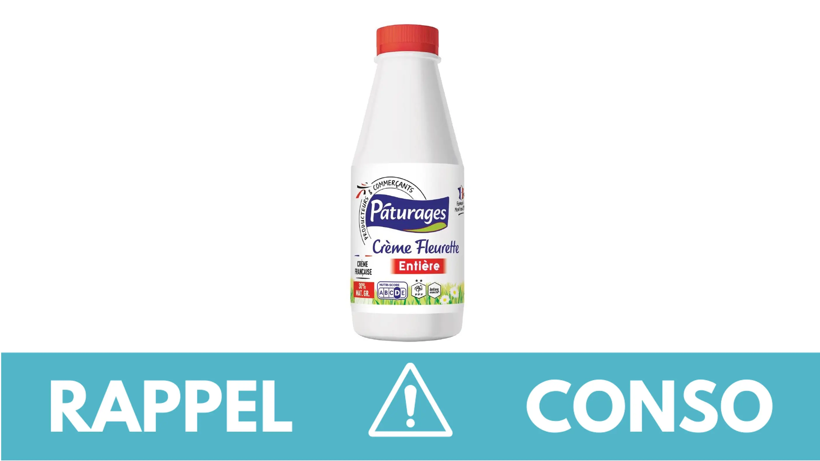 Le rappel consommateur concerne la Crème fleurette entière - 38cl de la marque PATURAGES. Elle a été commercialisée dans les enseignes Intermarché de France entière du 28/07/2023 au 03/08/2023.