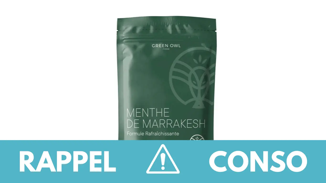 Le rappel consommateur concerne l'Infusion Menthe de Marrakech 3760318240174 de la marque Green Owl. Elles ont été commercialisées dans les enseignes Green Owl de Toulouse, Paris, Nîmes, Tosse, Grenoble, Bayonne et sur les site Veepee et greenowl.fr du 21/02/2022 au 16/11/2022.