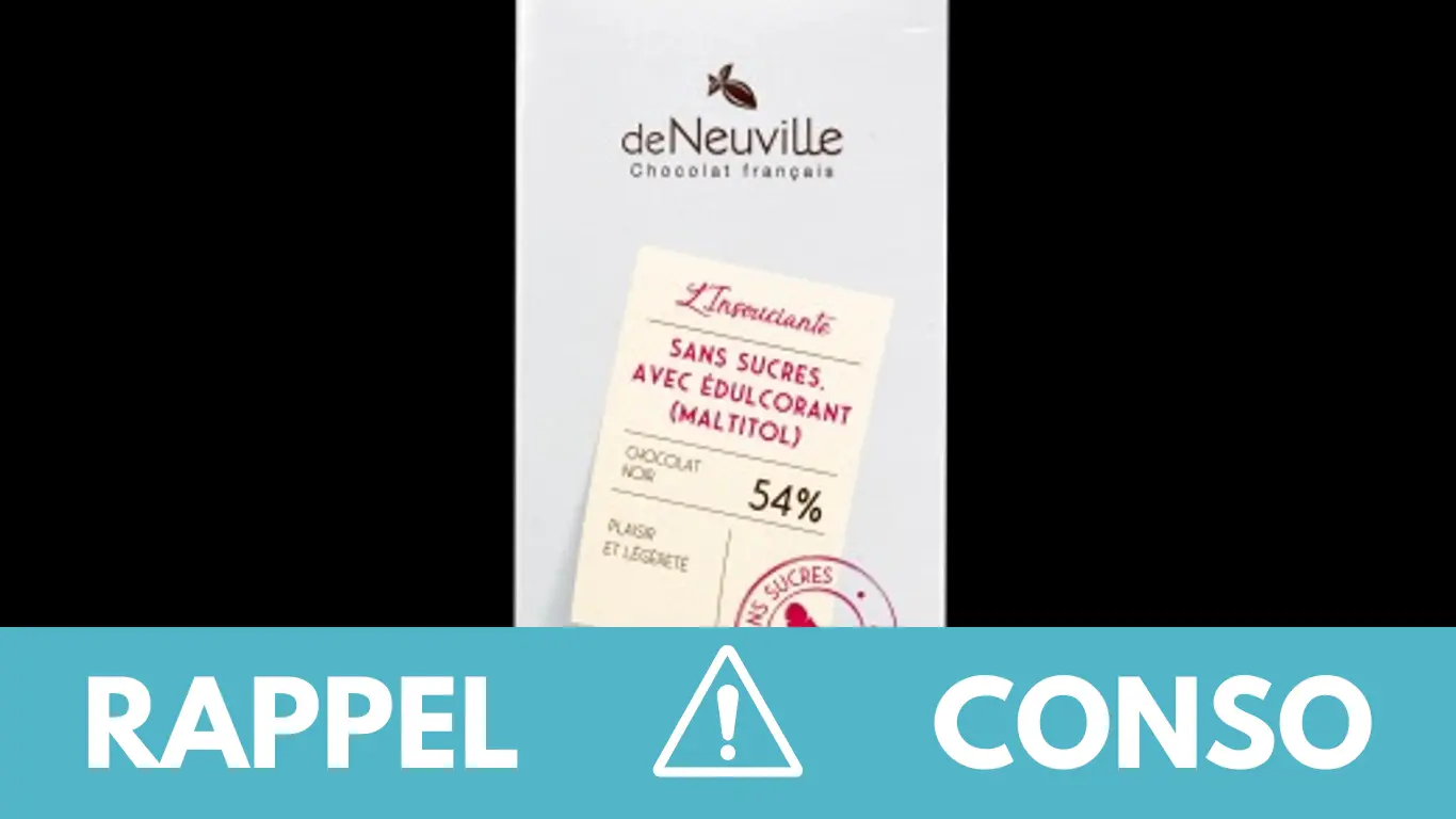 Le rappel consommateur concerne le chocolat L'insouciante tablette sans sucres avec édulcorant (maltitol) de la marque De Neuville. Il est commercialisé dans les enseignes De Neuville de France entière.