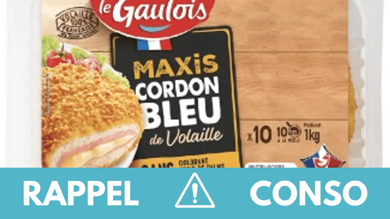 Le rappel consommateur concerne le MAXI CORDON BLEU DE VOLAILLE 1 KG de la marque LE GAULOIS, commercialisé dans les enseignes Auchan, Carrefour, Francap, Leclerc, Intermarché, Hyper U, Super U et U Express de France entière du 13/03/2025 au 20/03/2025.