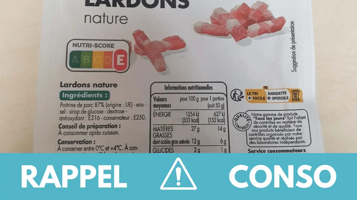 Le rappel consommateur concerne les lardons nature 200 g de la marque Tous les jours. Ils ont été commercialisés dans les enseignes CASINO, VIVAL, SPAR et réseaux de distribution de Casino, FRANPRIX et MONOPRIX de France entière du 30/04/2025 au 16/05/2025.