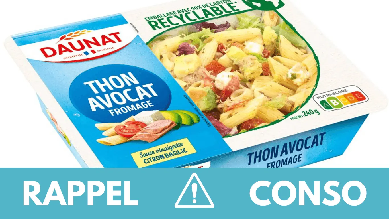 Le rappel consommateur concerne la salade ECOPACK Thon Avocat Fromage 240g de la marque Daunat. Elle a été commercialisée dans les enseignes Auchan, Avia, BP, Carrefour, Banque alimentaire Bourgogne, Dyneff, Elior (Esso, Franprix Fulli), Casino, Sedifrais, Leclerc, Leclerc Autoroute, Intermarché, Cora, JMA de France entière du 14/03/2025 au 26/03/2025.