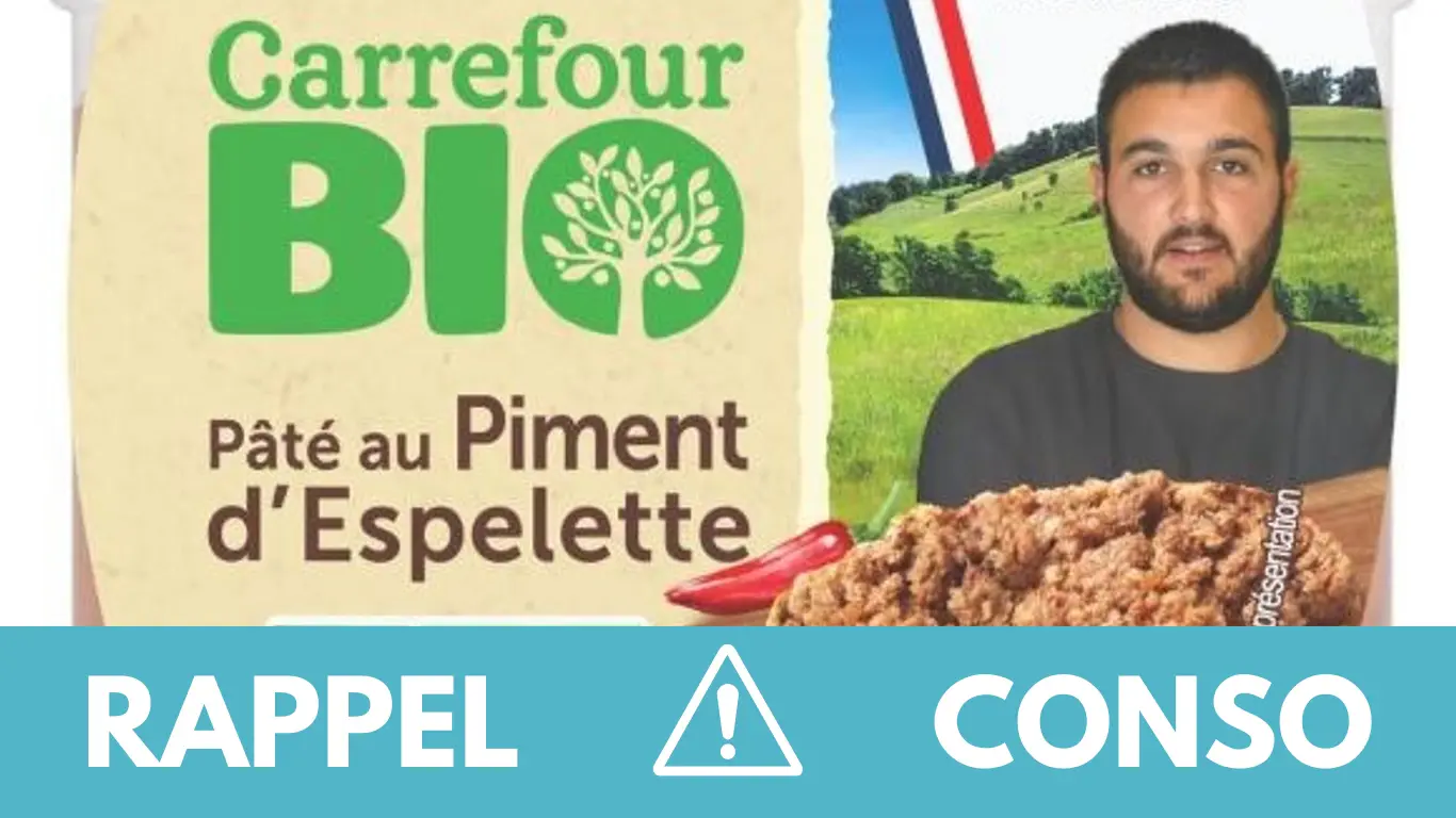 Le rappel consommateur concerne le Pâté au piment d'Espelette Carrefour bio 180g de la marque Carrefour BIO. Il est commercialisé dans les enseignes Carrefour de France entière du 31/07/2023 au 26/09/2023.