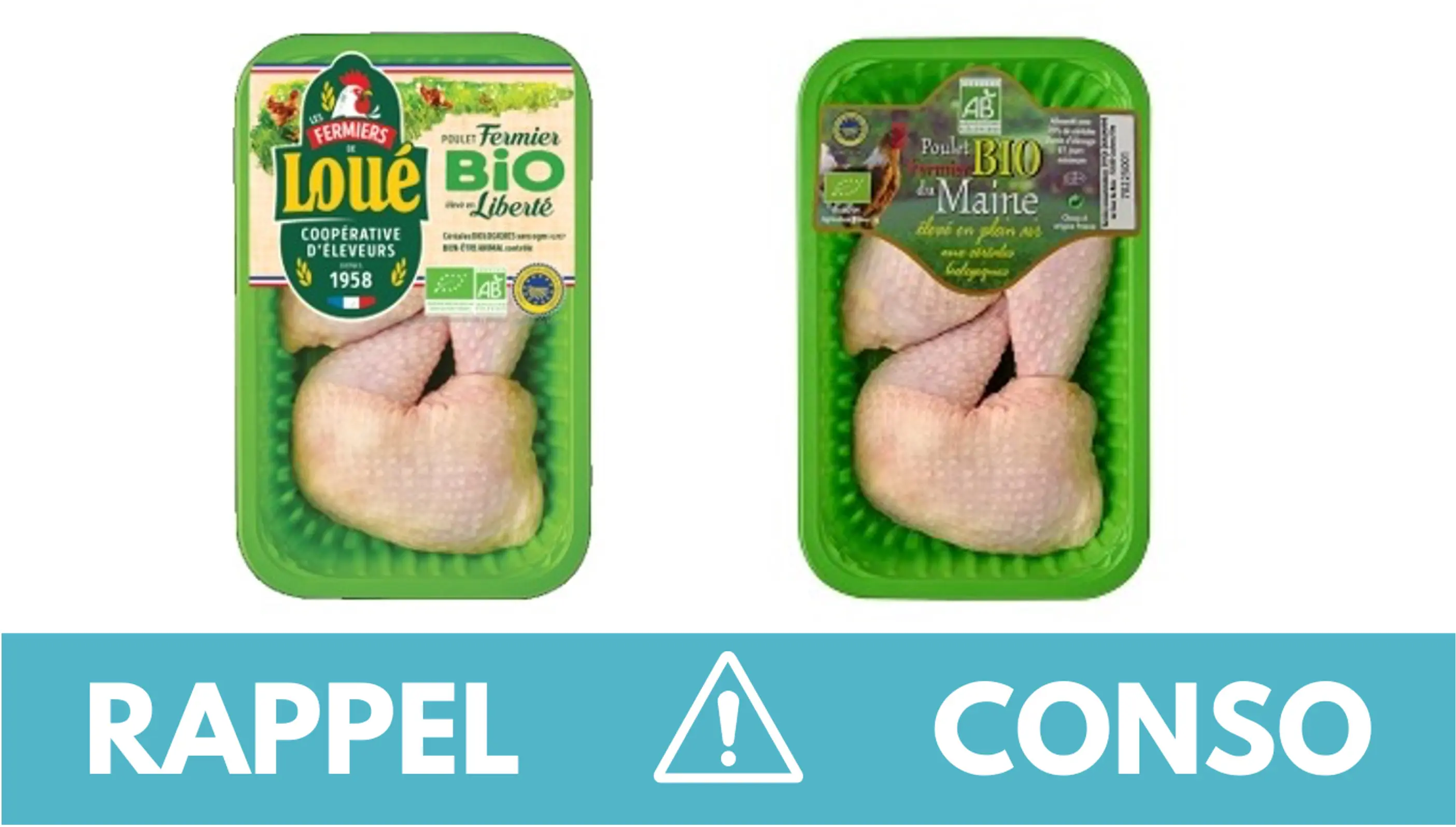 - Barquette 2 CUISSES DE POULET BIO et barquette 1 CUISSE DE POULET BIO de la marque BIO DE LOUÉ. Il est commercialisé dans les enseignes CARREFOUR, CARREFOUR MARKET, LECLERC, INTERMARCHE, REWE, BISCHOFF, de France entière du 05/07/2023 au 20/07/2023. Il s’agit du lot 3266980638795 2023086098 Date limite de consommation 20/07/2023 3266980020392 2023086098 Date limite de consommation 19/07/2023.