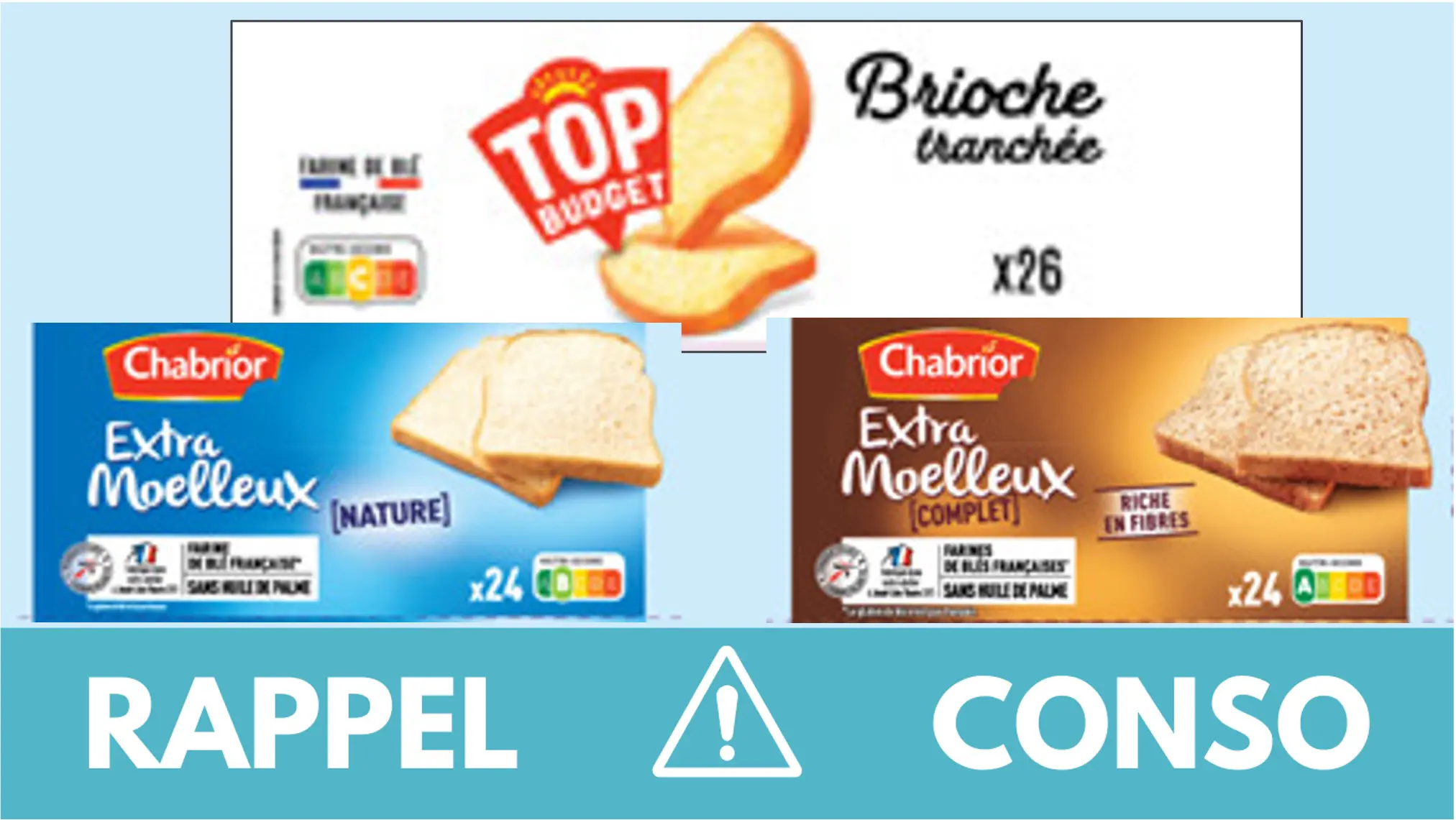 - le pain de mie Extra moelleux complet CHABRIOR 500g de la marque CHABRIOR. Il est commercialisé dans les enseignes INTERMARCHE de France entière du 01/06/2023 au 27/06/2023. Il s’agit du lot 3250390600848 23172362 Date de durabilité minimale 21/06/2023 3250390600848 23172412 Date de durabilité minimale 23/06/2023 3250390600848 23172462 Date de durabilité minimale 27/06/2023 3250390600848 23172512 Date de durabilité minimale 29/06/2023 3250390600848 23172552 Date de durabilité minimale 04/07/2023 3250390600848 23172561 Date de durabilité minimale 05/07/2023 3250390600848 23172681 Date de durabilité minimale 08/07/2023 3250390600848 23172762 Date de durabilité minimale 13/07/2023