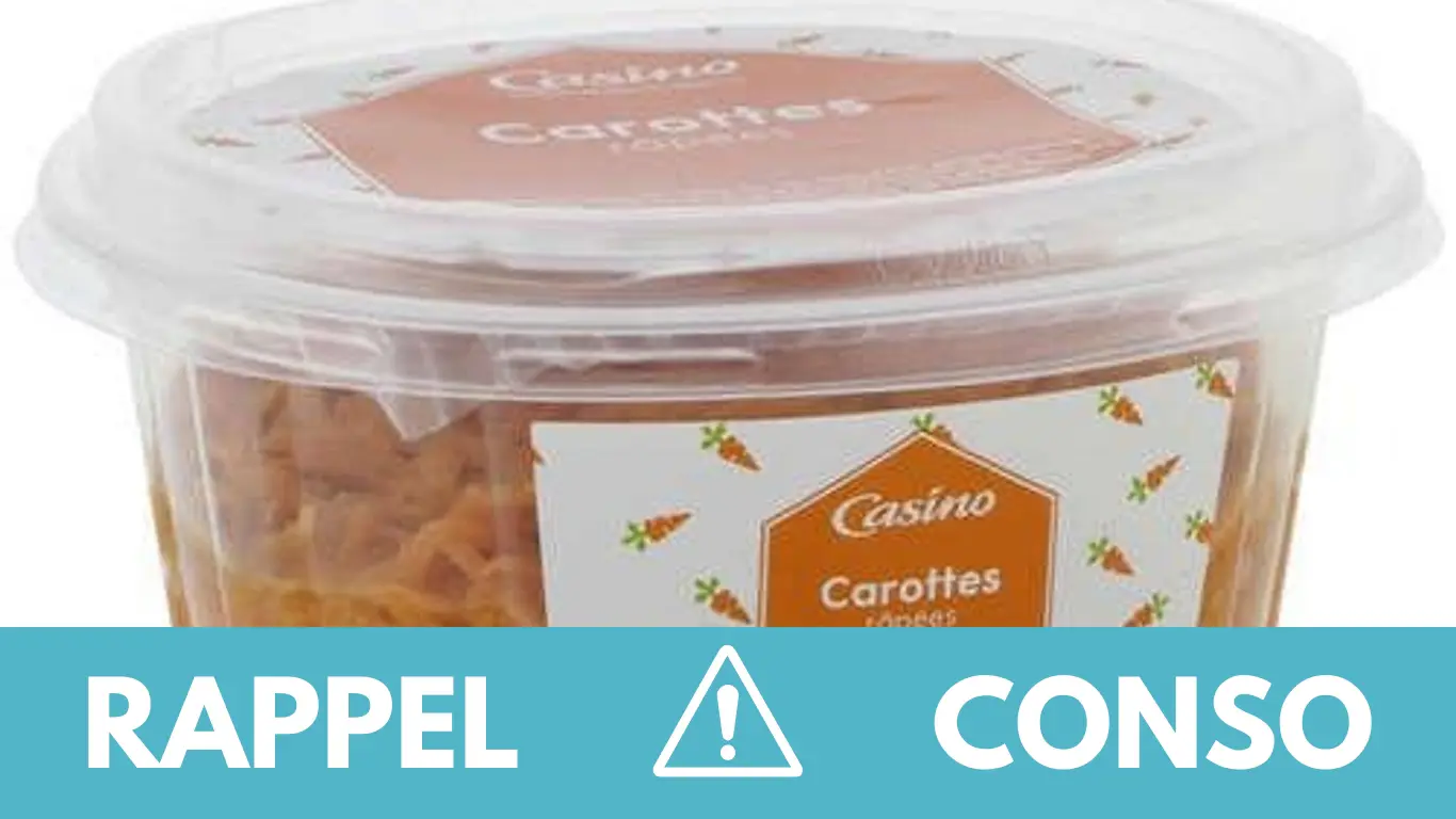 - les Carottes râpées 1Kg - Casino de la marque Casino. Il est commercialisé dans les enseignes CASINO, VIVAL, SPAR et réseaux de distribution de Casino de France entière du 27/10/2023 au 01/11/2023. Il s’agit du lot 3222477059603 330001 Date limite de consommation 14/11/2023.