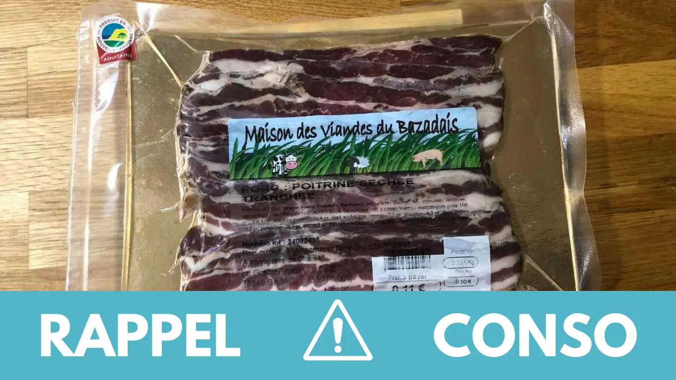 Le rappel consommateur concerne le PORC : POITRINE SÉCHÉE TRANCHÉE de la marque MAISON DES VIANDES DU BAZADAIS. Il est commercialisé dans les enseignes LECLERC, INTERMARCHÉ, CARREFOUR CONTACT, MAISON DUPUCH, SYSTÈME U, LES JARDINS DE GASCOGNE, NETTO de France entière du 28/03/2023 au 03/08/2023.