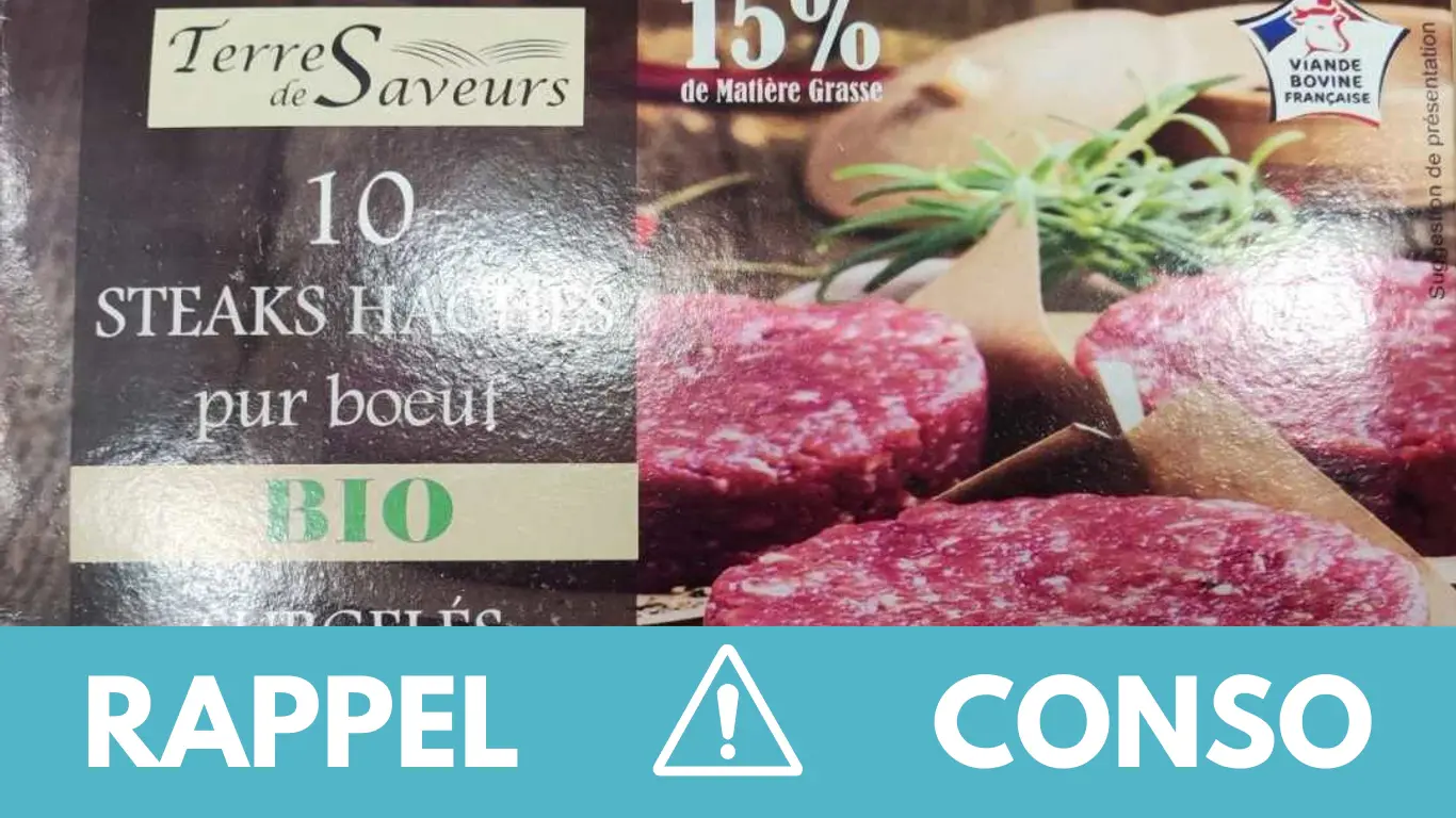 Le rappel consommateur concerne le Steak Haché pur bœuf BIO 10x100g de la marque Terre de Saveurs. Il est commercialisé dans les enseignes AQUITAINE BIOLOGIQUE de France entière du 28/06/2023 au 19/07/2023.