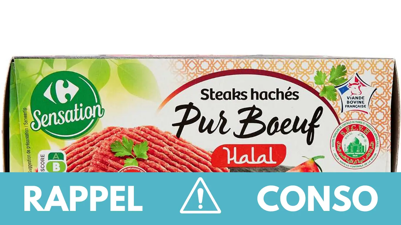 Le rappel consommateur concerne le STEAK HACHE SURGELE HALAL 15% 10X80G de la marque CARREFOUR SENSATION. Il est commercialisé dans les enseignes Carrefour de France entière du 12/10/2023 au 25/11/2023.