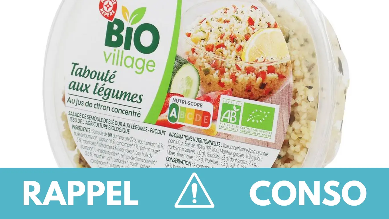 Le rappel consommateur concerne le TABOULE AUX LEGUMES 200G de la marque BIO VILLAGE. Il est commercialisé dans les enseignes E.LECLERC de France entière du 28/10/2023 au 01/11/2023.