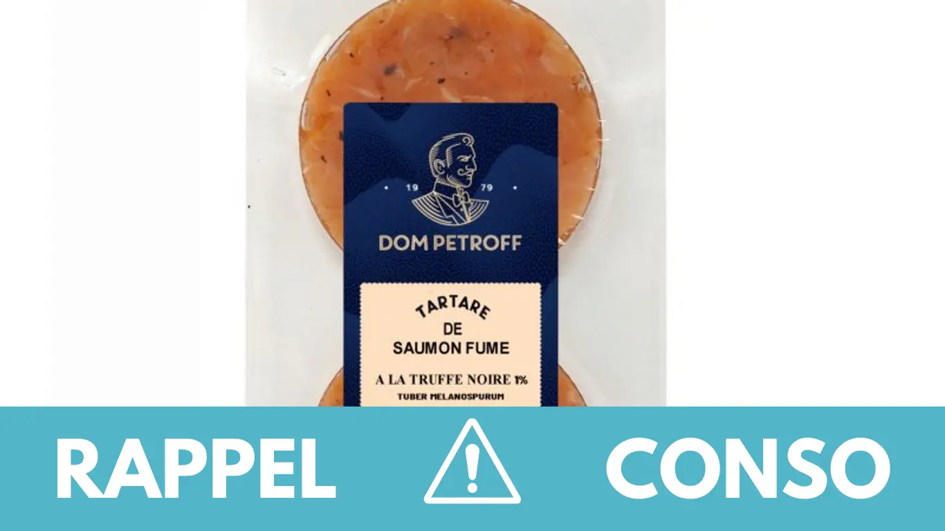 Le rappel consommateur concerne le tartare de saumon fumé à la truffe noire de la marque Dom Petroff. Il a été commercialisé dans les enseignes Monoprix, Leclerc, Galeries Lafayette de France entière du 22/11/2022 au 29/12/2022.