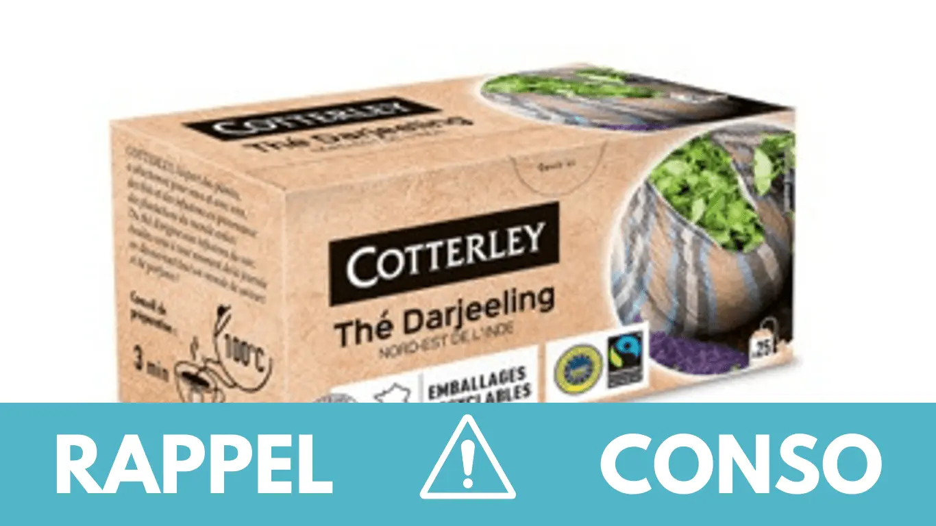 Le rappel consommateur concerne la Boîte de 25 sachets 50g de thé Darjeeling de la marque Cotterley. Elle a été commercialisée dans les enseignes INTERMARCHE de France entière du 05/12/2023 au 25/04/2024.