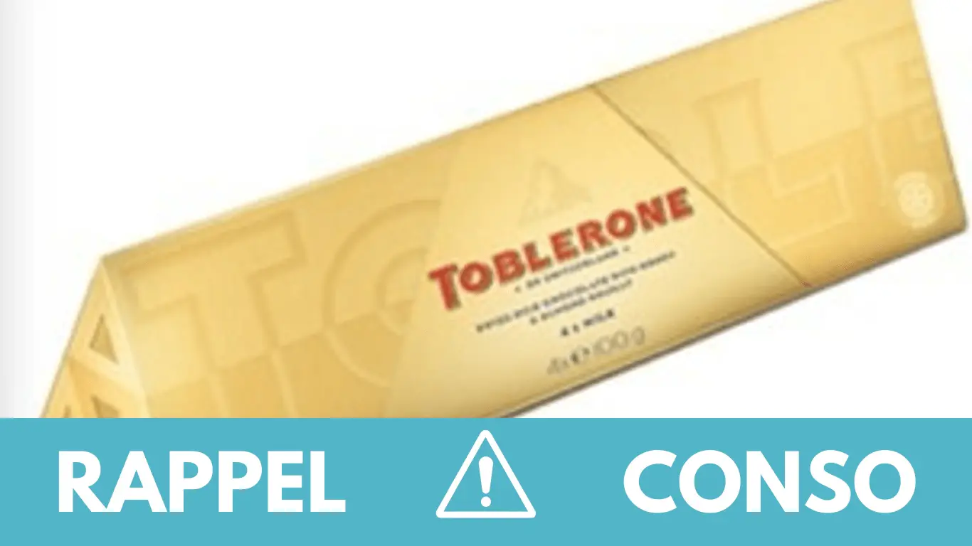 Le rappel consommateur concerne le TOBLERONE CHOCOLAT AU LAIT 4x100g de la marque Mondelez. Il est commercialisé dans les enseignes Relay, Trib's, Relais H de France entière du 22/11/2023 au 18/01/2024.