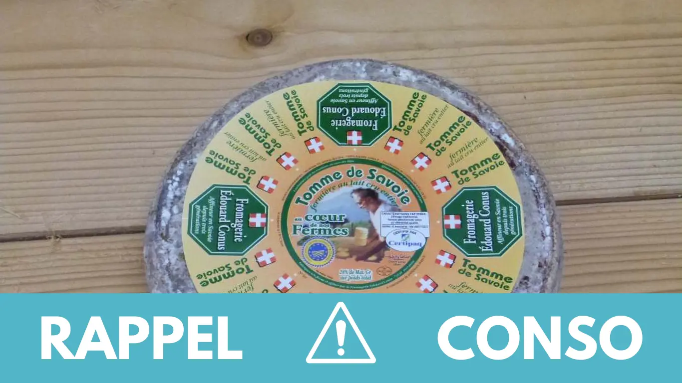 Le rappel consommateur concerne la Tomme de Savoie Fermière IGP de la marque Conus. Il est commercialisé dans les enseignes Carrefour (CSD Alby sur Chéran) et grossistes de France entière du 30/10/2023 au 02/11/2023.