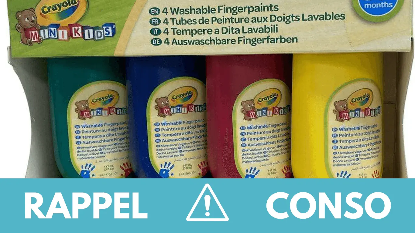 Le rappel consommateur concerne les tubes de peinture aux doigts Réf. Style#: 81-1476 - Code#: 81-1476-E-203 de la marque CRAYOLA Mini Kids. Ils ont été commercialisés dans les enseignes de la grande distribution (notamment Auchan, Carrefour, Cora, Leclerc, Hyper U) Magasins de jouets (notamment Joué Club, King Jouet, La Grande Récré, Maxi Toys, Starjouet, Tiniloo, Sajou) de France entière.