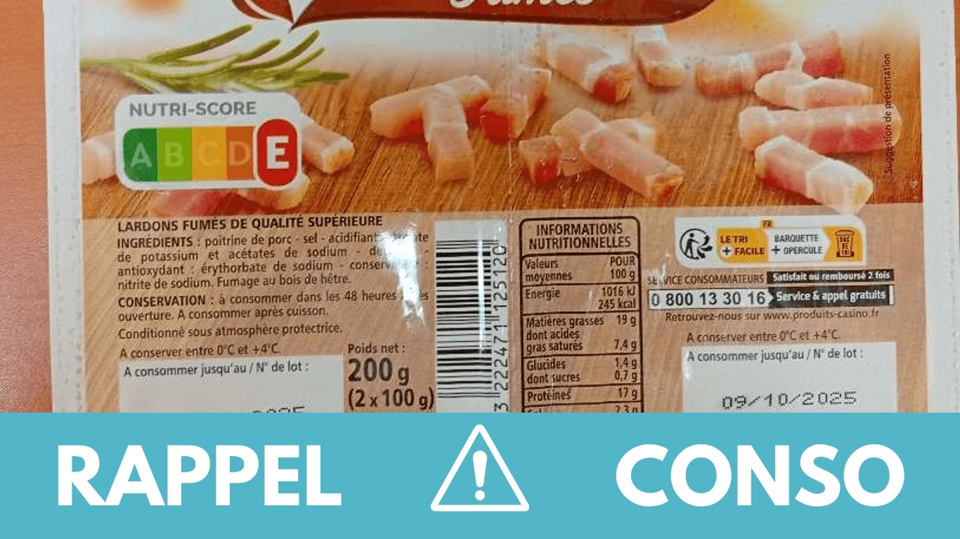Le rappel consommateur concerne les Lardons Fumés 2x100g de la marque Casino. Ils ont été commercialisés dans les enseignes CASINO, VIVAL, SPAR et réseaux de distribution de Casino de France entière du 21/08/2025 au 25/08/2025. Il s’agit du lot 3222471125120 7334008 Date limite de consommation 09/10/2025.