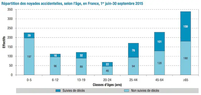 Entre juin et septembre 2015, des chercheurs ont recensé tous les cas de noyades ayant entraîné une hospitalisation ou un décès en France métropolitaine. Sur 1.266 noyades accidentelles survenues durant cette période, 436 (34%) ont entraîné la mort. Environ un accident sur cinq – 226 cas – concernait des enfants de moins de 6 ans, dont 29 sont décédés (11%). Près de la moitié des cas – 568 – concernait des adultes de plus de 45 ans, avec 260 décès (46%).