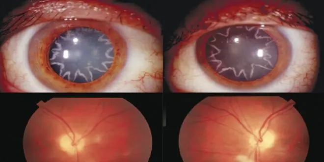 L'examen à la lampe à fente - qui permet d'observer en détails toutes les structures de l'œil - a permis de mettre en évidence des lésions bilatérales stellaires (en forme d'étoile) avec des opacités annonçant une cataracte d'origine électrique.