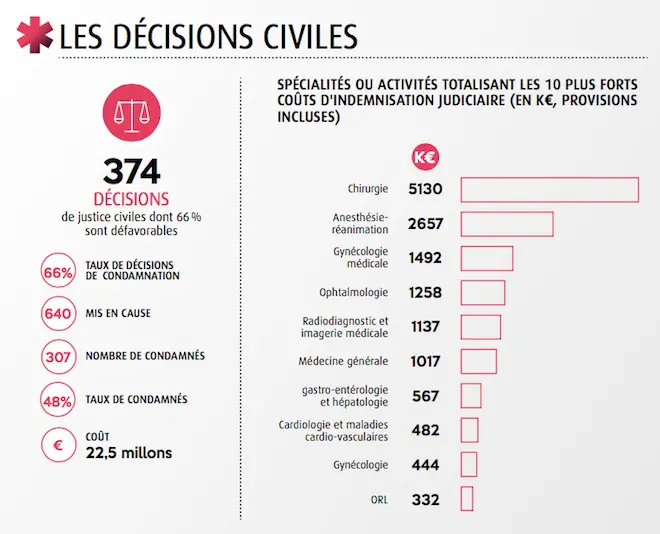 Au total, 391décisions de justice ont été prononcées en 2016 dont 374 décisions civiles. Dans 66% des cas elles ont abouti à une condamnation. Un chiffre en augmentation puisqu'en 2015, 55% des décisions s'étaient terminées par une condamnation et seulement 33% entre 1980 et 1984. "Une évolution très péjorative" selon Nicolas Gombault, Directeur Général Le Sou Médical - MACSF. " Aujourd'hui, les juges ont tendance à condamner les professionnels de santé ce qui permet une indemnisation des malades." La majorité des indemnisations concerne les spécialités chirurgicales.