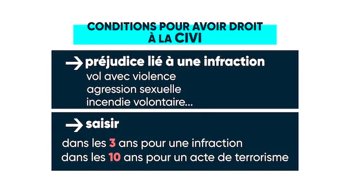 La CIVI doit être saisie dans les 3 ans de l’infraction, ce délai est de 10 ans pour les actes de terrorisme. Elle peut exceptionnellement accepter une demande hors délai pour motif légitime.