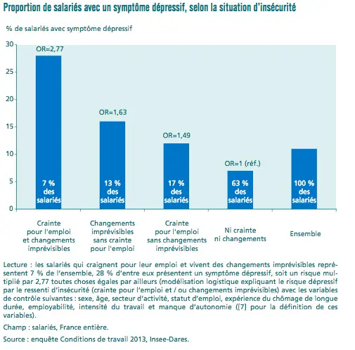 Une enquête de l'Agence européenne pour la santé et la sécurité au travail (EU-OSHA) avait montré en 2013 que le premier facteur de stress au travail en Europe était "la réorganisation du travail ou l'insécurité de l'emploi", avant "la charge de travail", le "harcèlement" ou le "manque de soutien des collègues et des supérieurs", rappelle la Dares. Plus les salariés ressentent fortement de l'insécurité, plus souvent ils présentent des symptômes dépressifs. Parmi ceux qui à la fois craignent pour leur emploi et vivent des changements (7% de l'ensemble des salariés), 28% présentent un symptôme dépressif, un risque 2,8 fois supérieur à ceux qui ne craignent rien.