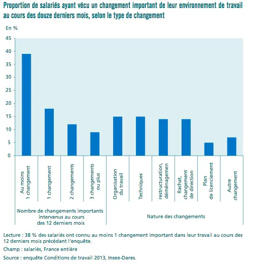 En 2013, les changements ont concerné quatre salariés français sur dix (au moins un changement pour 39%), selon l'étude de la Dares. Les plus cités concernent "l'organisation du travail", les "techniques utilisées", "une restructuration ou déménagement", un "rachat ou changement dans l'équipe de direction", devant un plan de licenciements.