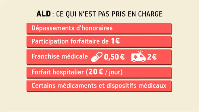 Les dépenses qui ne sont pas en rapport avec votre maladie ne sont pas remboursées à 100%, mais aux taux habituels. Or, les effets secondaires de certaines maladies sont parfois coûteux, comme les soins dentaires par exemple. Nous sommes donc loin de la gratuité des soins promise par la prise en charge à 100%.
