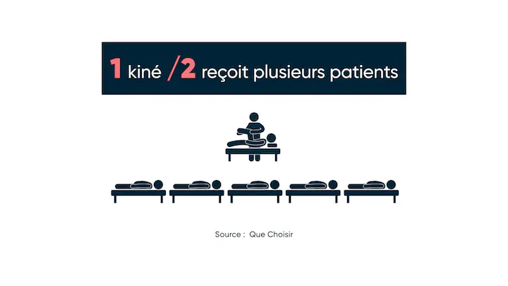 Le kiné ne doit pas prendre plus de trois patients simultanément, la séance doit durer 30 min/personne et les malades doivent avoir un programme de rééducation homogène. Là aussi, certains kinés contournent la réglementation. Par exemple, ils prennent cinq patients à la fois ou alors ils se contentent de donner les consignes au début du rendez-vous et vous laissent faire vos exercices seul pendant qu’ils s’occupent des autres. Or quand on est livré à soi-même, cela peut jouer sur la qualité de la rééducation.