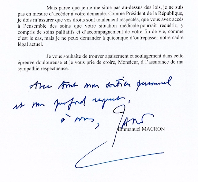 “Je ne suis pas surpris, je suis déçu par la réponse du président”, déplore Jean Luc-Roméro-Michel.“ Le président n’est pas au-dessus des lois, mais à aucun moment, dans cette lettre il n’évoque la possibilité d’une révision de la loi sur la fin de vie.”