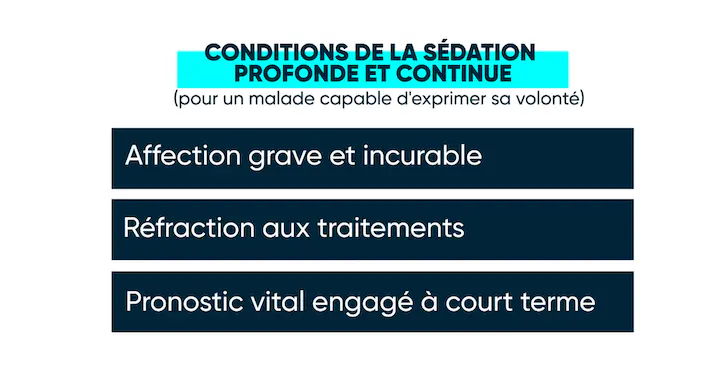 Quand les conditions sont réunies, les médecins peuvent mettre en place une sédation profonde et continue, c’est-à-dire altérer la conscience du patient, qui est endormi. Ils ne provoquent pas la mort directement, mais l’arrêt de l’alimentation et de l'hydratation, ou l’évolution de la maladie, provoquent le décès.