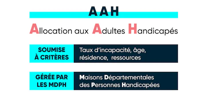 L'allocation aux adultes handicapés (AAH) est une aide financière qui permet d'avoir un minimum de ressources. Cette aide est attribuée sous réserve de critères d’incapacité, d'âge, de résidence et de ressources.