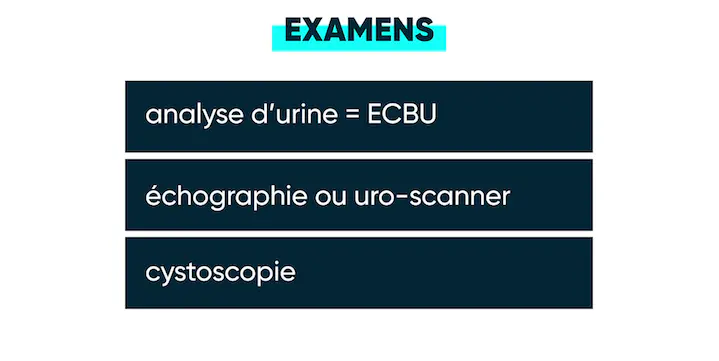 votre médecin généraliste vous fera passer un premier examen : une analyse d’urine ou ECBU. Selon les résultats de cet examen et l’interrogatoire médical, il pourra être amené à prescrire une échographie de l’appareil urinaire ou un uro-scanner.