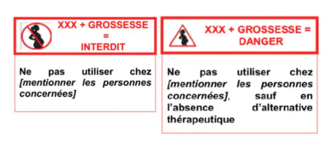 Il existe deux types de message: "nom du médicament + grossesse = danger", pour ceux à ne pas utiliser sauf en l'absence d'alternative thérapeutique, et "nom du médicament + grossesse = interdit", pour ceux à ne jamais utiliser lors de la grossesse.