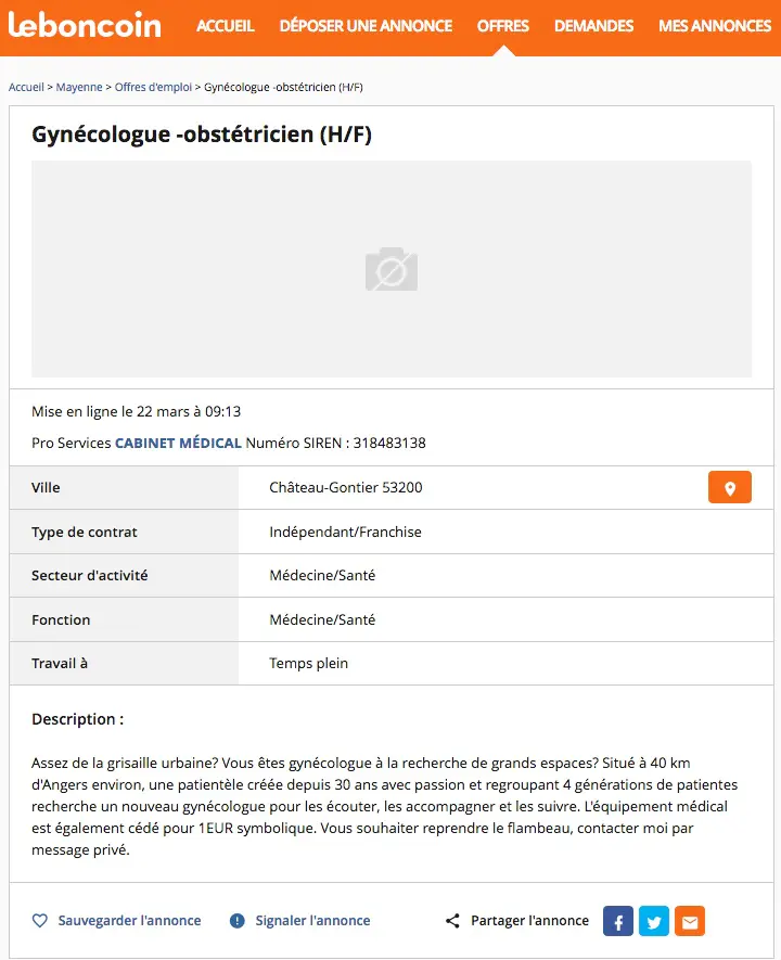 Les jours ont passé, mais la situation reste identique. Interrogée par la presse locale, la gynécologue explique avoir personnellement contacté divers médecins, "horrifiés à l'idée de s'installer ici". "Pour certains, [la Mayenne] c'est l'équivalent de la Creuse ou de la Lozère", déplore-t-elle. Pourtant, la région est loin d’être enclavée, et les infrastructures médicales aisément accessibles. À moitié pour provoquer, à moitié par dépit, elle a placé la semaine dernière une annonce sur un site d’échanges entre particuliers :
