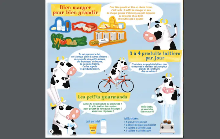 Dans une vidéo, le journaliste, Hugo Clément de France 2 raconte que sa belle-fille a eu droit à un cours de nutrition à l’école primaire. A l’aide de brochures, les enfants étaient amenés à faire des exercices dans lesquels on vantait les bienfaits du lait pour la santé. La personne qui animait cet atelier était une diététicienne salariée du CNIEL.