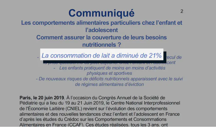 Dans son communiqué de presse, le CNIEL ne cache pas ses inquiétudes concernant la consommation de lait en baisse chez les jeunes. En effet, entre 2010 et 2016, la consommation est passée de 237 ml/jour à 202 chez les 3 à 5 ans et de 211 ml/jour à 181 chez les 6-8 ans. On peut se demander si c'est une préoccupation de santé publique de la part du CNIEL, on pourrait même en douter !