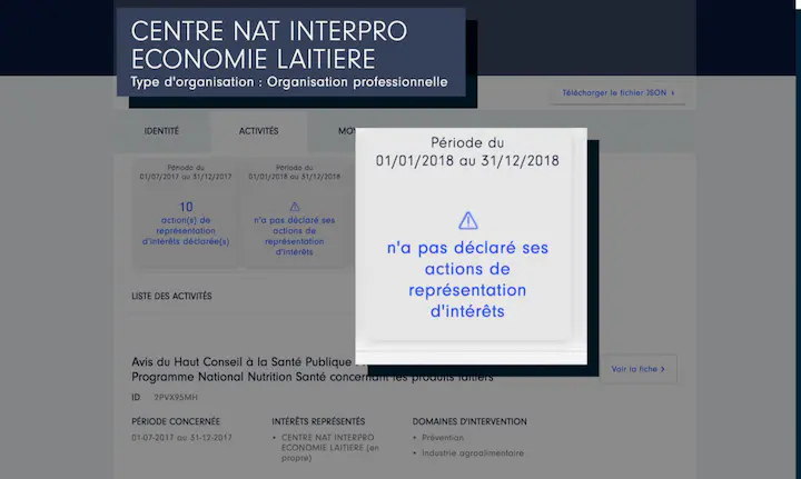 Normalement, les lobbies ont pour obligation de déclarer leurs actions sur le site de la" transparence de la vie publique". Seulement, quand on tape CNIEL sur le site on s’aperçoit que les déclarations n’ont pas été rendues publiques pour l’année 2018. Et là, c’est un vrai problème légal !