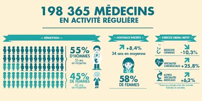 Selon l'Atlas 2015 de la démographie médicale, la France comptait "281.087 médecins", au 1er janvier 2015, soit 1,7% supplémentaire par rapport à l'année précédente. Ce décompte intègre les médecins retraités (65.548 étaient inscrits à l'Ordre des médecins en 2015, contre 60.823 en 2014). Plus d'un médecin retraité sur cinq (22,4%) continuerait d'exercer, soit une augmentation de 13,3% par rapport à l'année précédente.