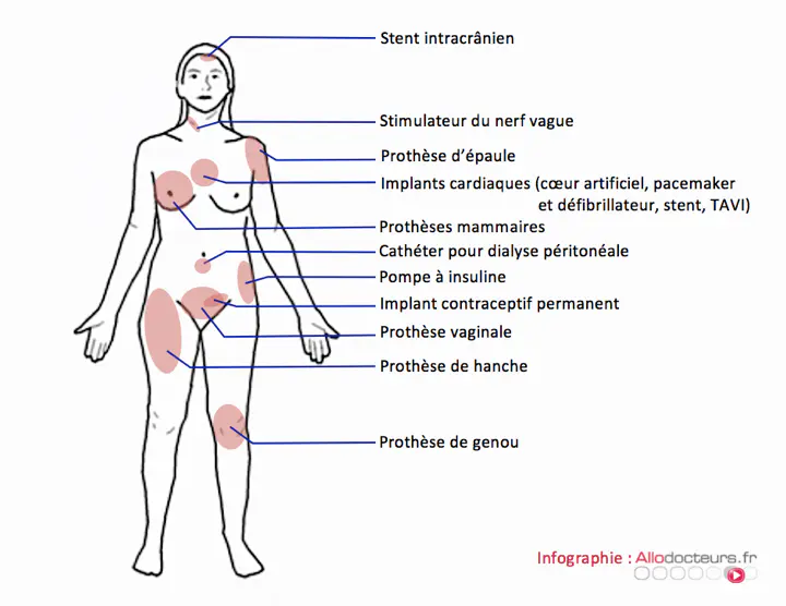 Le terme "implants médicaux" désigne tout dispositif artificiel destiné à être inséré dans un corps humain en tant que prothèse (y compris en chirurgie plastique), ou à des fins de traitement, de prévention ou de contraception. Des défibrillateurs aux valves cardiaques, en passant par les implants mammaires ou les pompes à insuline implantables, de très nombreux systèmes mécaniques ou électroniques peuvent désormais être incorporés à l’organisme humain.