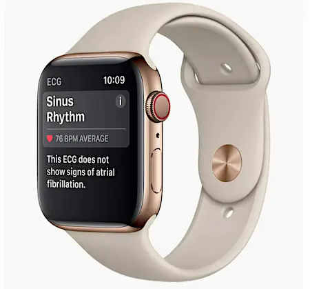 Cette nouvelle montre intègre un électrocardiogramme (ECG) composé de deux électrodes. La première est située au dos de la montre, l'autre dans une molette. Pour prendre une mesure, il faut poser le doigt sur la molette pendant 30 secondes. Grâce à une appli, la Watch produit un document (PDF) que l'on peut communiquer à un médecin. Apple s'est engagé à lancer cette montre aux Etats-Unis avant Noël, via une mise à jour. Pour la France, la demande est en cours comme "dans tous les pays où la watch sera commercialisée". Selon Le Monde, il faudra attendre de six mois à un an au minimum.