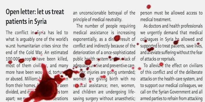 Source : Let us treat patients in Syria, lettre ouverte publiée dans the Lancet le 16 septembre 2013 (pdf). Cette lettre a été traduite et diffusée le 17 septembre par de nombreux quotidiens internationaux, parmi lesquels en France le quotidien Libération.